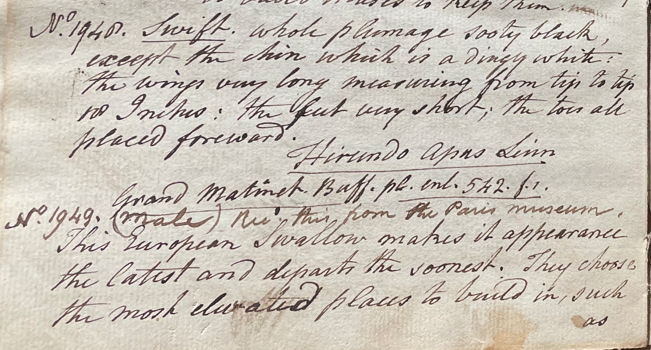 Charles Willson Peale (1741-1827) wrote, in his 38th Lecture (ca. 1799): "No. 1948. Swift. Whole plumage sooty black, except the chin which is a dingy white; the wings very long measuring from tip to tip 18 Inches; the feet very short; the toes all placed foreward. Hirundo apus Linn. Grand Martinet. Buff. pl. enl. 542. f. 1. No. 1949. (male). Recd this from the Paris Museum. This European Swallow makes its appearance the latest and departs the soonest." (Academy of Natural Sciences of Drexel University Archives, coll. 40)