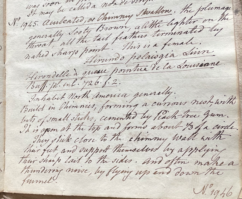 Charles Willson Peale (1741-1827) wrote, in his 38th Lecture (ca. 1799): "No. 1945. Aculcated, or Chimney Swallow. The plumage generally Sooty Brown, a little lighter on the throat; all the tail feathers terminated by naked sharp point. This is a female. Hirundo pelaisgia Linn. Hirondelle à queue pointue de la Louisiane Buff. pl. enl. 726. f. 2. Inhabit North America generally. Build in chimnies, forming a curious nest, with bits of small sticks, cemented by Peach-tree gum. It is open at the top and forms about 1/3 of a circle. They stick close to the chimney wall with their feet, and support themselves by applying their sharp tail to the sides, and often make a thundering noise, by flying up and down the funnel." (Academy of Natural Sciences of Drexel University Archives, coll. 40)