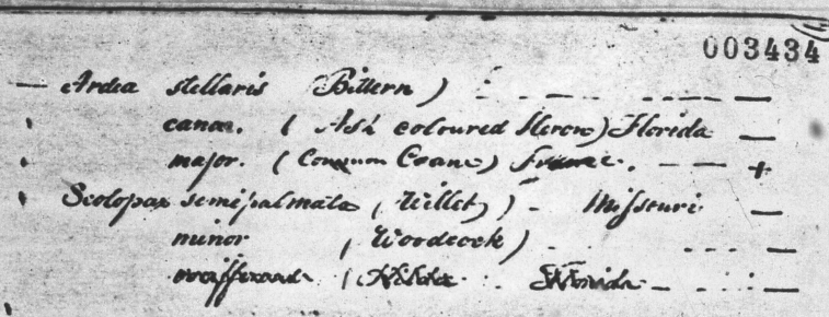 Peale wrote to Geoffrey on 13 July 1802: “Sir, Your favor of the 26 Feby and the Package of Birds I have received—they were in very good condition one or two only excepted.” (Miller 1988: 440)