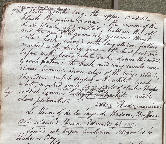 Peale then described a juvenile, which he presumed was a different species: "No. 733. Brown shouldered Heron. Bill 5 ½ Inches long, the upper mandible black, the under orange; the crown of the head black and crested; between the bill and the eye marked of a greenish yellow; throat white; neck covered with long slender feathers marked with dusky bars on the hind part, and before with broad white dashes down the middle of each feather; the back and wing coverts cenerious brown; inner edge of the wings reddish, shoulders russet striped with white; breast white, marked with long spots of black; legs reddish brown; under part of the body & vent white; middle claw pectinated. Ardea Hudsonius Linn. Le Hèron de la baye de Hudson, Buffon. Ash coloured Heron Edwards pl. 135. found at Cape Henlopen [Delaware]. Migrates to Hudsons Bay." (ANSP Archives, coll. 40)