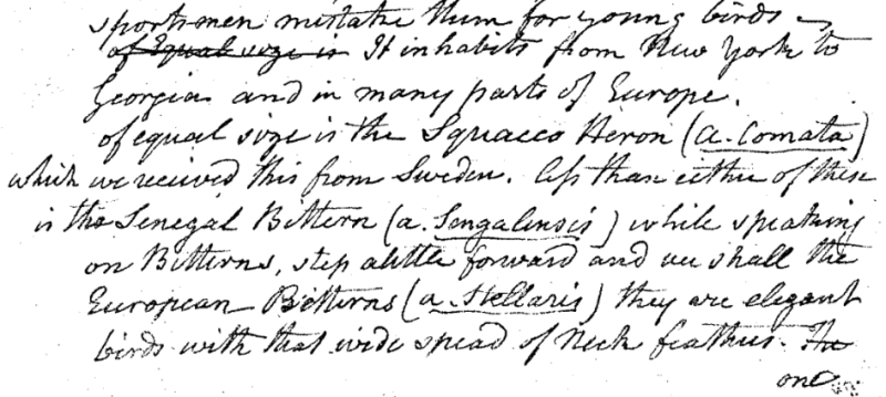 Charles Willson Peale (1741-1827) wrote, in "A Walk Through the Philad[elphi]a Museum" (1805–1806): "…of equal size [to Least Bittern, Ixobrychus exilis] is the Squacco Heron (A. Comata) which we received this from Sweden." (Historical Society of Pennsylvania, coll. 0481)