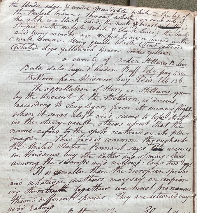 Charles Willson Peale (1741-1827) wrote, in his 25th Lecture (ca. 1799): "No. 741. Bittern. The upper part of the upper mandible dark; the under edge & under mandible white; the top of the [head] russet brown; throat white; on each side of the neck is a black band; the neck & breast is striped with russet white & black lines; the back and wing coverts are russet brown barred with dark brown; wing quills black; vent sallow white; legs yellowish green; irides yellow. a variety of Ardea stillaris Linn. Butor de la baye d'Hudson Buff. Vol. 7. pag. 430. Bitter from Hudsons Bay Edw. tab. 136." (Academy of Natural Sciences of Drexel University Archives, coll. 40)
