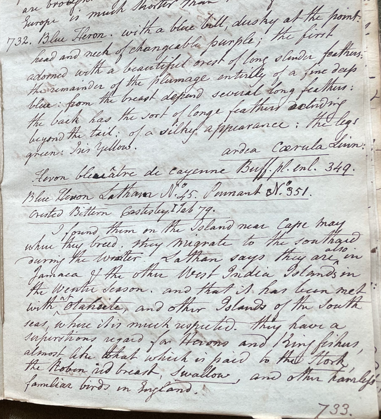 Charles Willson Peale (1741-1827) wrote, in his 25th Lecture (ca. 1799): "732. Blue Heron. with a blue bill, dusky at the point; head and neck of changeable purple; the first adorned with a beautiful crest of long slender feathers; the remainder of the plumage entirely of a fine deep blue; from the breast descend several long feathers; the back has the sort of longe feathers extending beyond the tail; of a silky appearance; the legs green; iris yellow. Ardea caerula Linn. Heron bleueâtre de Cayenne. Buff. pl. enl. 349. Blue Heron Latham No. 45. Pennant No. 351. Crested Bittern Catesby I tab 79." (Academy of Natural Sciences of Drexel University Archives, coll. 40)