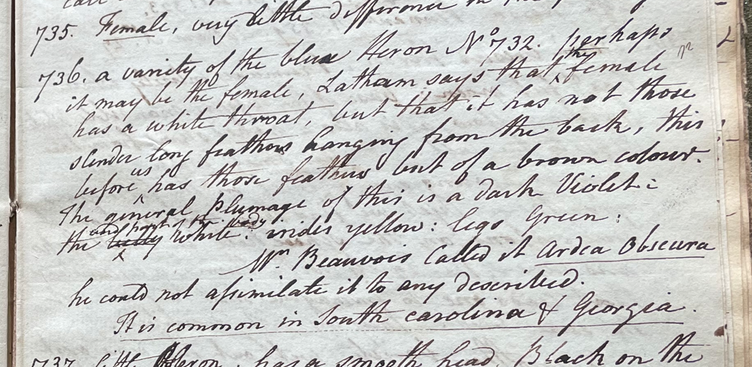 Charles Willson Peale (1741-1827) described a specimen, in his 25th Lecture (ca. 1799), which he considered a variety of Little Blue Heron (E. caerulea): "No. 736. A variety of the blue Heron No. 732. perhaps it may be the female, Latham says that the female has a white throat, but that it has not those slender long feathers hanging from the back; this [specimen] before us has those feathers but of a brown colour. The general plumage of this is a dark violet; the under parts of the body white; irides yellow; legs green. Mr. Beauvois called it Ardea obscura; he could not assimilate it to any described. It is common in South Carolina & Georgia." (Academy of Natural Sciences of Drexel University Archives, coll. 40)