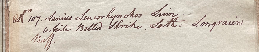 Charles Willson Peale (1741-1827) wrote, in his 15th Lecture (ca. 1799): "No. 107. Lanius Leucorhynchos Linn. White-bellied Shrike, Lath. Longraien Buff." (Academy of Natural Sciences of Drexel University Archives, coll. 40)