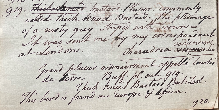 Charles Willson Peale (1741-1827) wrote, in his 26th Lecture (ca. 1799): "919. Thick-kneed Bustard Pluver. commonly called Thick Kneed Bustard. The plumage of a rusty grey, striped with brown. It was sent [to] me by my correspondant at London. Charadria oedicnemus Linn. Grand pluvier. Buff. pl. enl. 919. Thick kneed Bustard, Brit. Zool. This bird is found in Europe & Africa … 927. Probably the female of No. 919. Oedicnemus Linn. Grand pluvier, ou ordinairement courles de terre. Buff." (Academy of Natural Sciences of Drexel University Archives, coll. 40)