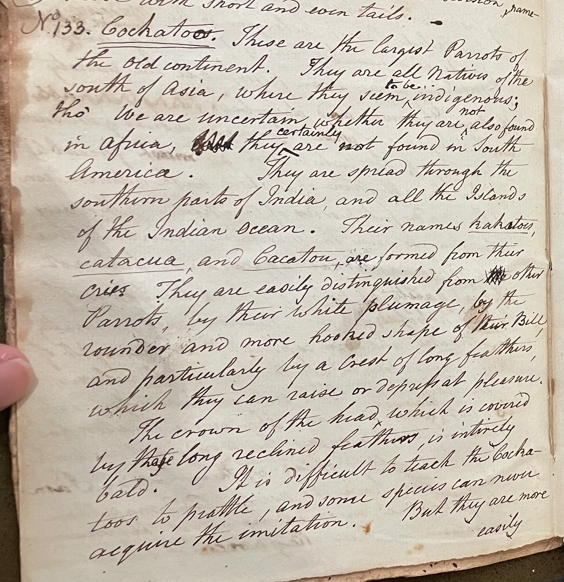 Peale wrote, in "A Walk Through the Philad[elphi]a Museum" (1805–1806): "But all the tribe none are so affectionate as the Cockatoo. They seem in a high degree to enjoy our attentions to them." (Historical Society of Pennsylvania, coll. 0481)