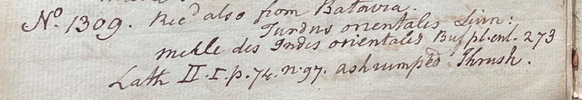 Peale evidently changed his mind about the identity of this specimen, and moved it in the genus Turdus, where he gave it a different number in his 31st Lecture (ca. 1799): "No. 1309. Recd…from Batavia. Turdus orientalis Linn.; Merle des Indes Orientalis Buff. pl. enl. 273. Lath. II. I. p. 74. n. 97. ash rumped Thrush." (ANSP Archives, coll. 40)