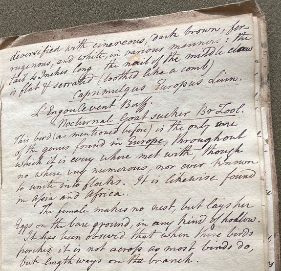 Charles Willson Peale (1741-1827) wrote, in his 39th Lecture (ca. 1799): "No. 1974. Goat-sucker. This is the European bird. The length 10 ½ Inches; the plumage can scarce be well described; the ground colour is almost black, but most beautifully diversified with cinereous, dark brown, ferruginous, and white, in various manners; the tail 4 Inches long; the nail of the middle claw is flat & serrated (toothed like a comb). Caprimulgus Europus Linn. L'Engoulevent Buff. Nocturnal Goat sucker. Br. Zool. This bird (as mentioned before) is the only one of the genus found in Europe, throughout which it is every where met with, though no where very numerous, nor ever known to unite into flocks. It is likewise found in Assia and Africa. The female makes no nest, but lays her eggs on the bare ground, in any kind of hollow. It has been observed that when these birds perch it is not across as most birds do, but lengthways on the branch." (Academy of Natural Sciences of Drexel University Archives, coll. 40)