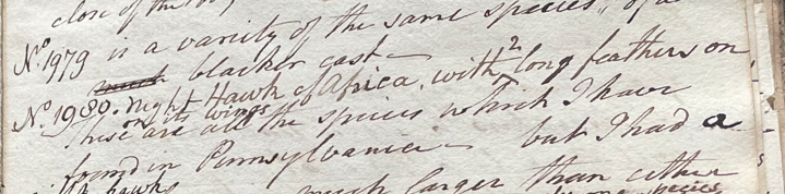 Charles Willson Peale (1741-1827) listed, in his 39th Lecture (ca. 1799): "No. 1980. Night-Hawk of Africa. With 2 long feathers on its wings." (Academy of Natural Sciences of Drexel University Archives, coll. 40)