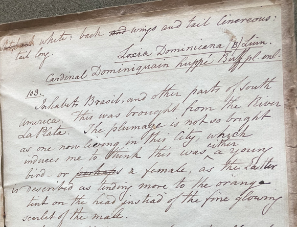 Charles Willson Peale (1741-1827) wrote, in his 32nd Lecture (ca. 1799): "1425. Crested Dominican Gross Beak. Head much crested, ending in a point like the Cardinal Gross Beak [i.e., Norther Cardinal, Cardinalis cardinalis], head and fore part of the neck, red; beneath white; back, wings and tail cinerious; tail long. Loxia Dominicana Linn. Cardinal Dominiquain huppé Buff. pl. enl. 103. Inhabits Brasil and other parts of South America. This was brought from the River La Plata. The plumage is not so bright as one now living in this city [Philadelphia], which induces me to think this was either a young bird, or a female, as the latter is described as tending more to the orange tint on the head instead of the fine glowing scarlet of the male." (Academy of Natural Sciences of Drexel University Archives, coll. 40)