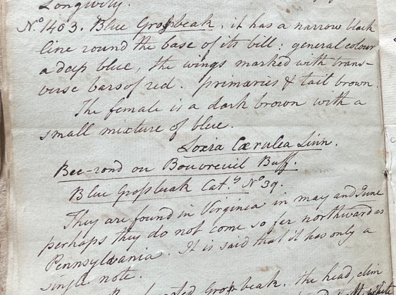 Peale wrote, in "A Walk Through the Philad[elphi]a Museum" (1805–1806): "The blue Gross beak (L. Caerulea) found in the southern States, seldom come to the north of Virginia." (Historical Society of Pennsylvania, coll. 0481)