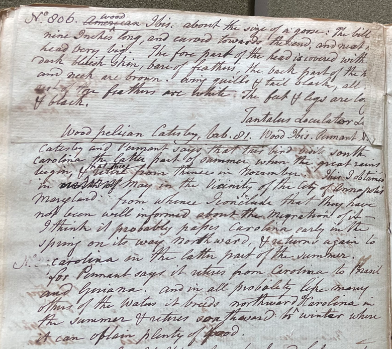 Peale wrote, in "A Walk Through the Philad[elphi]a Museum" (1805–1806): "The Wood Ibis (T. Loculator) is considerably like the Egyptian Ibis — They are common in Georgia & sometimes seen more northerly." (Historical Society of Pennsylvania, coll. 0481)