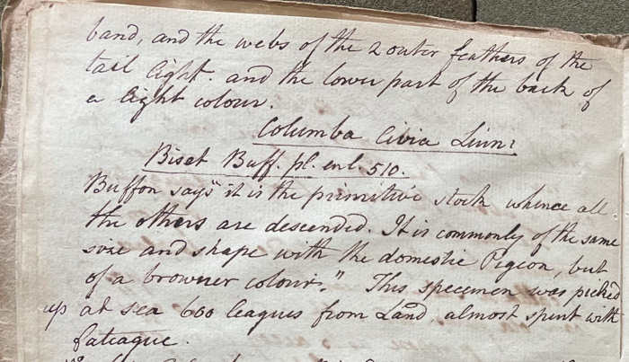 Charles Willson Peale (1741-1827) wrote, in his 30th Lecture (ca. 1799): "No. 1163. Biset Pigeon. Length about 14 Inches; bill pale red; head ash-coloured; hind part of the neck & side green gold, glossed with copper in different lights; the general colour ash; it has two black bands across the wings; the end of the tail [has a] broad black band, and the webs of the 2 outer feathers of the tail light; and the lower part of the back of a light colour. Columba livia Linn. Biset, Buff. pl. enl. 510. Buffon says 'it is the primitive stock whence all the others are descended. It is commonly of the same size and shape with the domestic Pigeon, but of a browner colour.' This specimen was picked up at sea, 600 leagues from land, almost spent with fateague..." (Academy of Natural Sciences of Drexel University Archives, coll. 40)