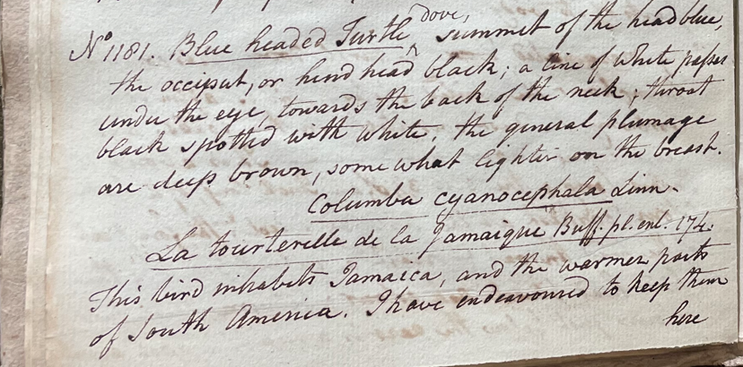 Peale wrote, in his 30th Lecture (ca. 1799): "No. 1181. Blue headed Turtle dove. Summit of the head blue, the occiput, or hind head, black; a line of white passes under the eye, towards the back of the neck; throat black spotted with white; the general plumage are deep brown, somewhat lighter on the breast. Columba cyanocephala Linn. La tourterelle de la Jamaique Buff. pl. enl. 174. This bird inhabits Jamaica and the warmer parts of South America. I have endeavored to keep them [alive] here, but our winters are too severe for them." (Academy of Natural Sciences of Drexel University Archives, coll. 40)