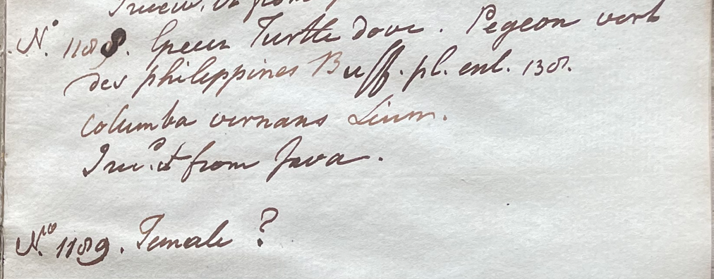 Charles Willson Peale (1741-1827) wrote, in his 30th Lecture (ca. 1799): "No. 1188. Green Turtle dove. Pigeon vert des Philippines Buff. pl. enl. 138. Columba vernans Linn. I recd it from Java. No. 1189. Female?" (Academy of Natural Sciences of Drexel University Archives, coll. 40)
