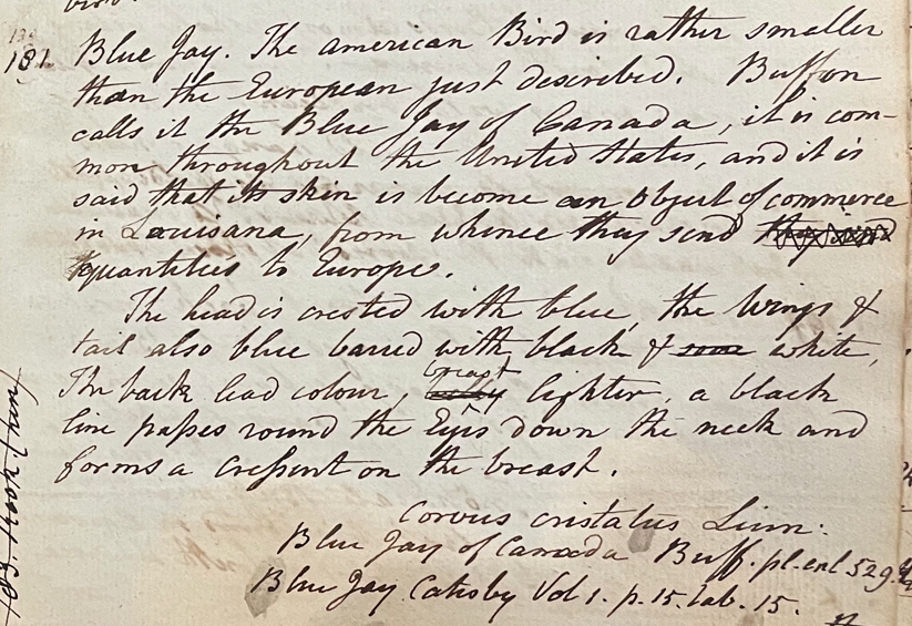 In his 17th Lecture, Peale wrote: "182. Blue Jay. The American Bird is rather smaller than the European just described [i.e., Eurasian Jay, Garrulus glandarius]. Buffon calls it the Blue Jay of Canada. It is common throughout the United States, and it is said that its skin is become an object of commerce in Louisiana, from whence they send quantities to Europe. The head is crested with blue; the wings & tail also blue barred with black & white; the back lead colour; breast lighter; a black line passes round the Eyes, down the neck, and forms a cressent on the breast. Corvus cristatus Linn. Blue Jay of Canada. Buff. pl. enl. 529. Blue Jay Catesby Vol. 1. p. 15. tab. 15." (Academy of Natural Sciences of Drexel University Archives, coll. 40)