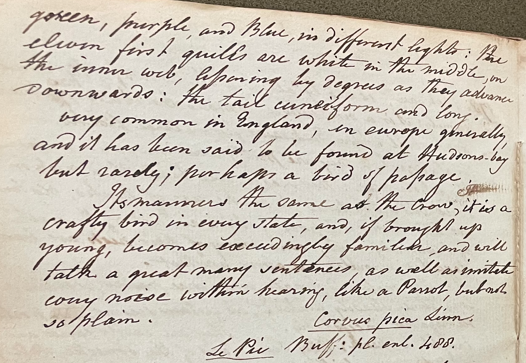 Charles Willson Peale (1741-1827) wrote, in his 17th Lecture (ca. 1799): "No. 179. Magpie. It is smaller than the Jackdaw. The bill black; irides hazel; the scapulars, and all the upper parts of the Belly white; the rest of the plumage is Black, glossed with green, purple, and Blue, in different lights; the elevent first quills are white in the middle, on the inner web, lessening by degrees as they advance downwards; the tail cuneiform and long. Very common in England, in Europe generally, and it has been said to be found at Hudsons Bay but rarely; perhaps a bird of passage. Its manners [are] the same as the crow; it is a crafty bird in every state, and, if brought up young, becomes exceedingly familiar, and will talk a great many sentences, as well as imitate every noise within hearing, like a Parrot, but not so plain. Corvus pica Linn. Le Pie Buff. pl. enl. 488. (Academy of Natural Sciences of Drexel University Archives, coll. 40)