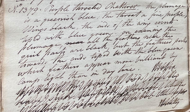 Peale wrote, in "A Walk Through the Philad[elphi]a Museum" (1805–1806): "No. [blank] Purple throated Chatterer (A. Cayana) This elegant Bird is a Native of the warmest parts of South America." (Historical Society of Pennsylvania, coll. 0481)