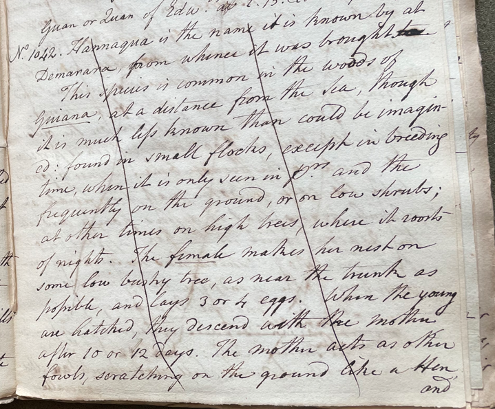 Charles Willson Peale (1741-1827) wrote, in his 28th Lecture (ca. 1799): "No. 1042. Hannaqua is the name it is known by at Demarara, from whence it was brought. This species is common in the woods of Guiana, at a distance from the sea, though it is much less known than could be imagined; found in small flocks, except in breeding time, when it is only seen in prs. and [then] frequently on the ground, or on low shrubs; at other times on high trees, where it roosts [at] night. The female makes her nest on some low brushy tree, as near the trunk as possible, and lays 3 or 4 eggs. When the young are hatched, they descend with the mother after 10 or 12 days. The mother acts as other fowls, scratching on the ground like a Hen, and brooding the young, which quit their nurse the moment they can [shift] for themselves. They have 2 broods in a year; one in December or January, the other in May or June." (Academy of Natural Sciences of Drexel University Archives, coll. 40)