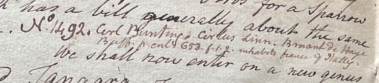 Charles Willson Peale (1741-1827) wrote, in his 33rd Lecture (ca. 1799): "No. 1492. Cerl Bunting. Cirlus Linn. Bruant de Haye Buff. pl. enl. 653. f. 1. 2. Inhabits France & Itally." (Academy of Natural Sciences of Drexel University Archives, coll. 40)