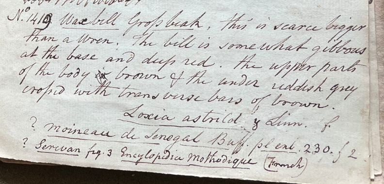 Charles Willson Peale (1741-1827) wrote, in his 32nd Lecture (ca. 1799): "No. 1419. Waxbill Grossbeak. This is scarce bigger than a wren. The bill is somewhat gibbous at the base and deep red. The upper parts of the body brown & under reddish grey crossed with transverse bars of brown. Loxia astrild Linn. ?Moineau de Senegal. Buff. pl. enl. 230. f. 2. ?Serevan fig. 3 Encyclopedia Methodique (French). (Academy of Natural Sciences of Drexel University Archives, coll. 40)