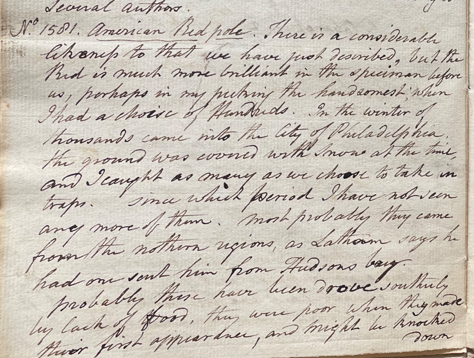 Peale continued: "No. 1581. American Redpole. There is a considerable likeness to that we have just described, but the Red is much more brilliant in the specimen before us, perhaps in my picking the handsomest, when I had a choise of hundreds. In the winter of [blank] thousands came into the City of Philadelphia. The ground was covered with snow at the time, and I caught as many as we choose to take in traps, since which period I have not seen any more of them. Most probably they came from the northern regions, as Latham says he had one sent him from Hudsons Bay. Probably these have been drove southerly by lack of food, then were poor when they made their first appearance, and might be knocked down with sticks. No. 1582. Female, it has the same black patch on the throat as that of Europe—it is red on the top of the head, but none of that colour on the breast." (ANSP Archives, coll. 40)