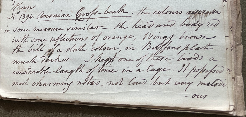Charles Willson Peale (1741-1827) wrote, in his 32nd Lecture (ca. 1799): "The succeeding genus Loxia Grossbeak is more numerous and we have a prity variety before us. The bill in this genus is strong, convex above & below, and very thick at the base; nostrils small and round; Tongue entire or as if cut off at the end. The first species generally taken notice of amongst this genus of birds is the cross-bill." (Academy of Natural Sciences of Drexel University Archives, coll. 40)