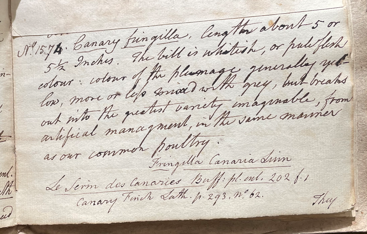 Charles Willson Peale (1741-1827) wrote, in his 34th Lecture (ca. 1799): "No. 1574. Canary fringilla. Length about 5 or 5 ½ Inches. The bill is whitish, or pale flesh colour; colour of the plumage generally yellow, more or less mixed with grey, but breaks out into the greatest variety imaginable, from artificial management, in the same manner as our common poultry. Fringilla Canaria Linn. Le Serin des Canaries Buff. pl. enl. 202. f. 1. Canary Finch Lath. p. 293. No. 62. They inhabit, in a wild state, the Canary Islands chiefly, as well as others; as Palma, Cape Verd, Fayal, Madeira, and are said to frequent watery places." (Academy of Natural Sciences of Drexel University Archives, coll. 40)