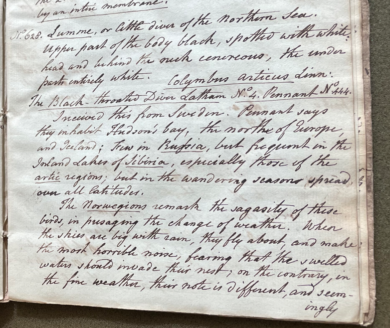 Charles Willson Peale (1741-1827) wrote, in his 24th Lecture (ca. 1799): "No. 628. Lumme, or little diver of the Northern Sea. upper part of the body black, spotted with white; head and behind the neck cinereous, the under parts entirely white. Colymbus articus Linn. The Black-throated Diver Latham No. 4. Pennant No. 444. I received this from Sweden." (Academy of Natural Sciences of Drexel University Archives, coll. 40)