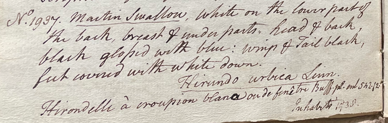 Charles Willson Peale (1741-1827) wrote, in his 38th Lecture (ca. 1799): "No. 1937. Martin Swallow. White on the lower part of the back, breast & underparts; head & back, black glossed with blue; wings & tail black; feet covered with white down. Hirundo urbica Linn. Hirondelle à croupion blanc ou de fenêtre. Buff. pl. enl. 542. f. 2. Inhabits Europe generally, and Mr. Pennant says, during summer in Newfoundland and New York; of this I am doubtful." (Academy of Natural Sciences of Drexel University Archives, coll. 40)