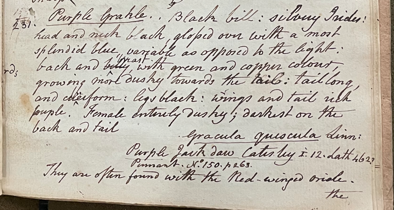 Charles Willson Peale (1741-1827) wrote, in his 17th Lecture (ca. 1799): "No. 231. Purple Grakle. Black bill; silvery irides; head and neck black, glossed voer with a most splendid blue, variable as opposed to the light; back and belly breast with green and copper colour, growing more dusky towards the tail; tail long, and cuneiform; legs black; wings & tail rich purple. Female entirely dusky, darkest on the back and tail. Gracula quiscula Linn. Purple Jackdaw Catesby I. 12. Lath. 462. Pennant No. 150. p. 263. They are often found with the Red-winged Oriole, the red-winged blackbird [i.e., Agelaius phoeniceus]. These are all commonly called blackbirds." (Academy of Natural Sciences of Drexel University Archives, coll. 40)