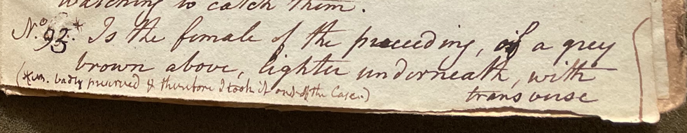 Peale wrote, in "A Walk Through the Philad[elphi]a Museum" (1805–1806): "… the female of the preceeding, of a grey brown above, lighter underneath with transverse brown lines, the black list beneath the eyes formed with cetaceous feathers is scarcely seen. The wings and tail are something darker than the back. It is only now and then that we meet with these birds near Philadelphia." (Historical Society of Pennsylvania, coll. 0481)