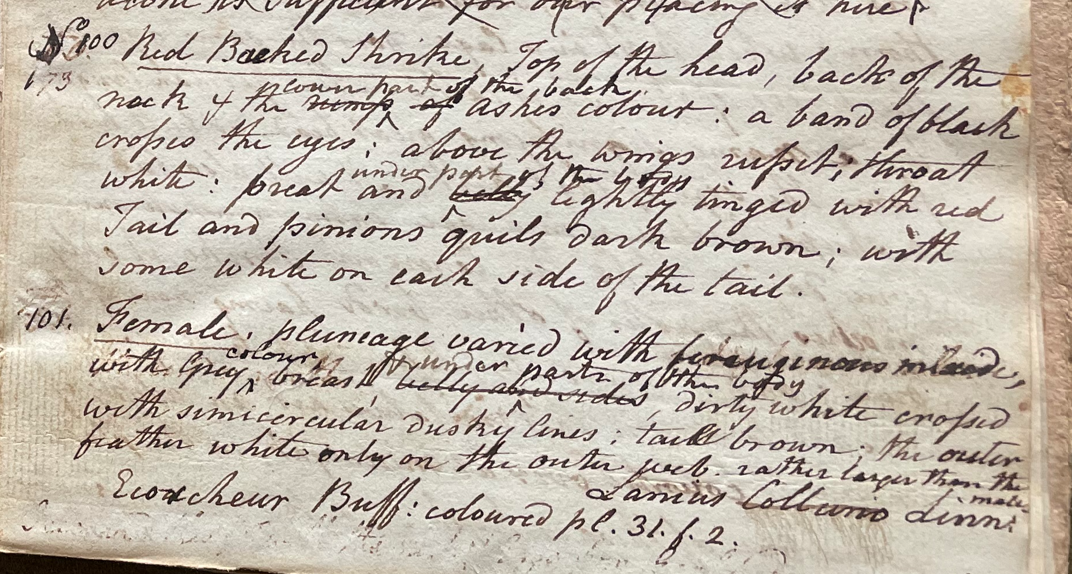 Charles Willson Peale (1741-1827) wrote, in his 15th Lecture (ca. 1799): "No. 100. Red-backed Shrike. Top of the head, back of the neck & the lower part of the back ashen colour; a band of black crosses the eyes; above the wings russet; throat white; breast and underparts of the body lightly tinged with red. Tail and pinions quils dark brown; with some white on each side of the tail." (Academy of Natural Sciences of Drexel University Archives, coll. 40)