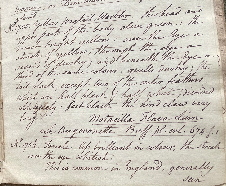 Charles Willson Peale (1741-1827) wrote, in his 35th Lecture (ca. 1799): "No. 1755. Yellow Wagtail Warbler. the head and upper parts of the body olive green; the breast bright yellow; over the Eye a streak of yellow; through the Eye a second [streak] of dusy; and beneath the Eye a third [streak] of the same colour; quills dusky; the tail black, except two of the outer feathers, which are half black & half white, divided obliquely; feet black; the hind claw very long. Motacilla flava Linn. La Bergeronette Buff. pl. enl. 674. f. 1. [sic, =2]" (Academy of Natural Sciences of Drexel University Archives, coll. 40)