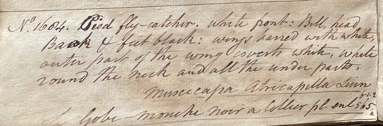 Charles Willson Peale (1741-1827) wrote, in his 35th Lecture (ca. 1799): "No. 1684. Pied Flycatcher. White front; bill, head, back & feet black; wings barred with white, outer part of the wing coverts white, white round the neck and all the under parts. Muscicapa atricapilla Linn. Le Gobe-mouche noir a collier Pl. enl. 565. f.1.2. No. 1685. female Pied Flycatcher (male). Upper parts brown; under a dingy white. Inhabits France & England, and as far north as [L…]. In that Diocese stay the whole year and, during winter, frequently take refuge in the […] Houses. Muscicapa atricapilla Linn. … No. 1689. Pied Flycatcher (female). Gobe-mouche noir de Loraine Buff. pl. enl. 565 f. 2&3. M. atricapilla Linn." (Academy of Natural Sciences of Drexel University Archives, coll. 40)