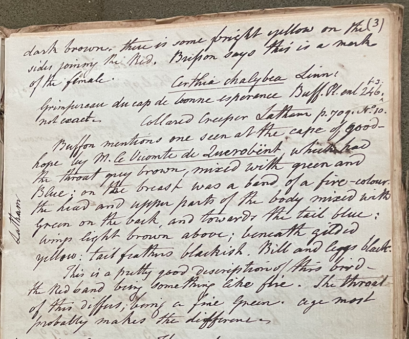 Charles Willson Peale (1741-1827) wrote, in his 20th Lecture (ca. 1799): "401. Collared Creeper. length about 4 ½ Inches; Bill ¾ of an Inch long; the head, neck and back a glossy deep green; the breast a beautifull Ruby Red; this colour is separated from the green on the neck by a violet band; the Belly is grey with greenish tinge; the upper coverts of the tail fine violet; quills of the wings & tail dark brown. There is some bright yellow on the sides joining the Red. Brisson says this is a mark of the female. Certhia chalybea Linn. Grimpereau du Cap de bonne Esperance Buff. pl. enl. 246, f. 3. not exact. Collared Creeper Latham p. 709. No. 10." (Academy of Natural Sciences of Drexel University Archives, coll. 40)