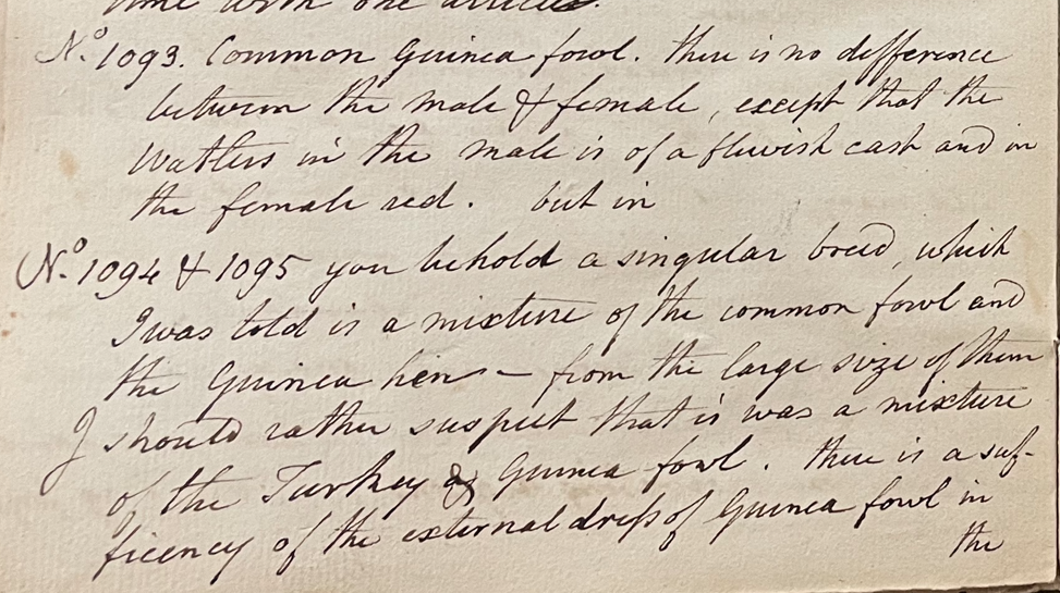 Peale continued: "The Pintado is one of those birds which seek, by weltering in the dust, to rid themselves of insects. They also scrape the ground like common hens, and roam in numerous flocks. Bodies of 2 or 3 hundred together are sometimes seen in the Isle of May; and the inhabitants hunt them with a grey-hound, and without tother weapons than sticks. Buffon is very lengthy on this subject. I have selected what I thought most interesting, for other particulars I must refer you to him, as I have already engrossed a sufficiency of your time with one article. / No. 1093. Common Guinea fowl. There is no difference between the male & female, except that the wattles in the male is of a [blueish] cast and in the female red." (ANSP Archives, coll. 40)