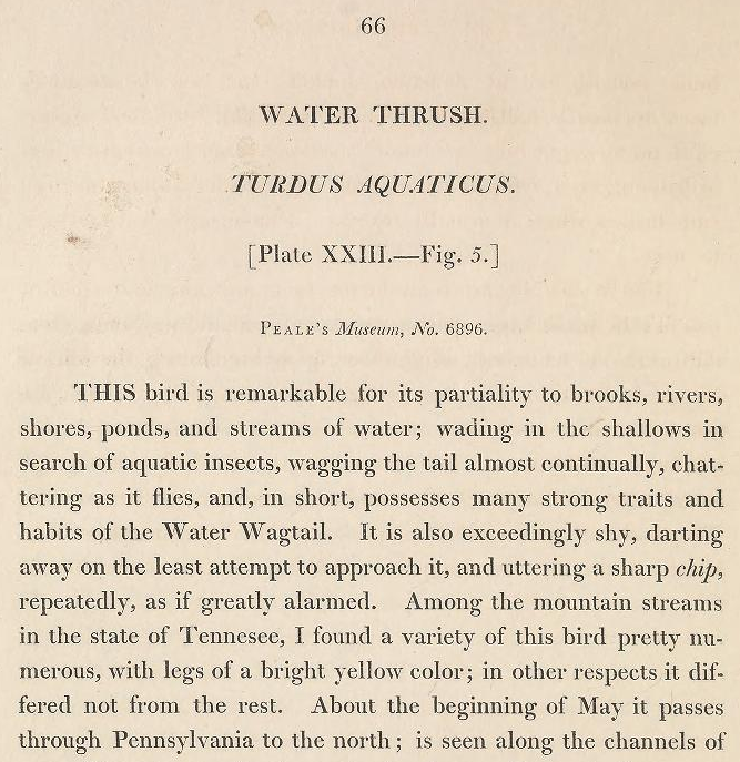 Alexander Wilson (1766-1813) described a species under the name "Water Thrush / Turdus aquaticus" in American Ornithology vol. 3 (Pl. 23), where "Peale's Museum, No. 6896" was cited (Wilson 1811: 66). The species is not identifiable, and likely based on specimens of two morphologically similar species: Northern Waterthrush (Parkesia noveboracensis) and Louisiana Waterthrush (P. motacilla).