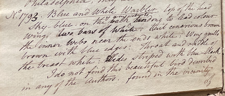 Charles Willson Peale (1741-1827) wrote, in his 36th Lecture (ca. 1799): "No. 1793. Blue and White Warbler. top of the head sky-blue; on the back & wings tending to lead colour; wing [with] two bars of white; tail cenerious brown, the inner webs near the ends white; wing quills brown with blue edges; throat and middle of the breast white; sides striped with blue-black. I do not find this beautiful bird described in any of the Authors. found in the vicinity of Philad[elphi]a. Among the spring birds. Rare." (Academy of Natural Sciences of Drexel University Archives, coll. 40)