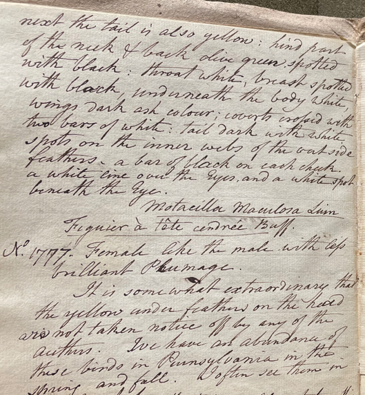 In his 36th Lecture, Peale wrote: "No. 1776. Yellow rump Warbler. The top of the head cinerous, but if the middle of the feathers is seaparated the under feathers are a fine yellow; on each side of the breast, on the back, next [to] the tail, is also yellow; hind part of the neck & back olive green, spotted with black; throat white, breast spotted with black; underneath the body white; wings dark ash colour; coverts crossed with two bars of white; tail dark with white spots on the inner webs of the outside feathers; a bar of black on each cheek; a white line over the Eyes, and a white spot beneath the Eye. Motacilla maculosa Linn. Figuier à tête cendrée Buff. No. 1777. Female, like the male, with less brilliant plumage. It is somewhat extraordinary that the under feathers on the head are not taken notice off [sic] by any of the authors. I've had an abundance of these birds in Pennsylvania in the spring and fall. I often see them in our Market." (Academy of Natural Sciences of Drexel University Archives, coll. 40)