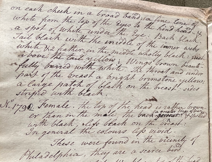 Peale continued: "No. 1792. Female. the top of the head is rather browner than in the male; the back a greater tinge of green & spotted with black; less black on the breast; in general the colours less vivid. These were found in the vicinity of Philadelphia. They are a scarce bird." (ANSP Archives, coll. 40)