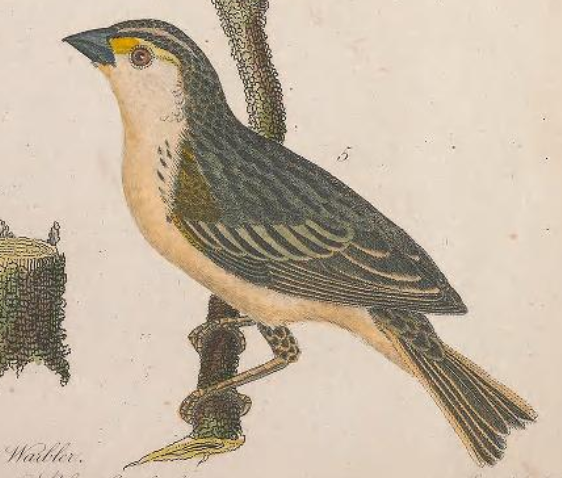 Charles Willson Peale (1741-1827) wrote, in his 34th Lecture (ca. 1799): "No. 1610. Green Shouldered Sparrow. It is a small bird. It may be distinguished by two good marks, besides the yellow green on the shoulders, it has a yellow line from base of the bill on each side extending to the upper part of the Eyes; also a bright yellow edge to the wings. the top of the head dark with a white line in the center; this assimilates it considerably to the white throat sparrow No. 1591; back, wings & tail brown russet & grey and the breast & underparts sallow white. No. 1611. Female, much like the male." (Academy of Natural Sciences of Drexel University Archives, coll. 40)