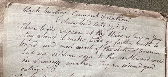 In his 33rd Lecture, Peale wrote: "No. 1472. Black bunting commonly called Snowbird. the head, back and wings sooty black, breast and under parts white. Emberiza hyemalis Linn. Black bunting Pennant & Latham. Snow bird Catesby, i. 34. These birds appear at Hudsons bay in June, stay about 2 weeks, and go farther north to breed, and visit most of the states of America but are seldom seen to the southward except in snowy weather. They are esteemed good eating." (Academy of Natural Sciences of Drexel University Archives, coll. 40)