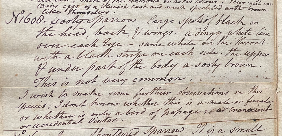 Peale wrote, in "A Walk Through the Philad[elphi]a Museum" (1805–1806): "The Sooty Sparrow … [was] found in the vicinity of Philadelphia. very few of our Sparrows have been described by Naturalists." (Historical Society of Pennsylvania, coll. 0481)