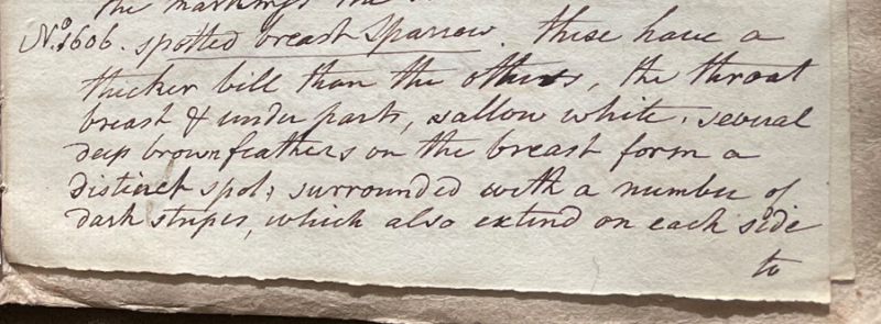Charles Willson Peale (1741-1827) wrote, in his 34th Lecture (ca. 1799): "No. 1606. Spotted breast Sparrow. These have a thicker bill than the others; the throat, breast & under parts, sallow white, several deep brown feathers on the breast form a distinct spot, surrounded with a number of dark stripes, which also extend on each side to the tail; a dash of the same dark colour on each side of the throat; top of the head, back & wing coverts striped with black russet & grey; wing quills & tail brown edged with russet. No. 1607. Female. the general plumage the same, with less of the red cast; more of the cinerous or ashen colour. Their nest contains eggs of a blueish cast and [is] much speckled with brown like themselves." (Academy of Natural Sciences of Drexel University Archives, coll. 40)