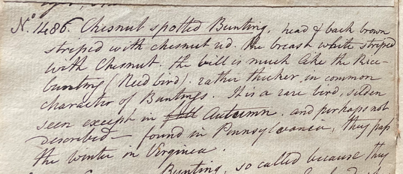 Peale wrote, in "A Walk Through the Philad[elphi]a Museum" (1805–1806): "The Chesnut spotted bunting is a rare bird here, perhaps not described – found in the Autumn in Pennsylvania. They pass the Winter in Virginia." (Historical Society of Pennsylvania, coll. 0481)