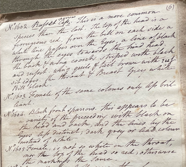Peale wrote, in "A Walk Through the Philad[elphi]a Museum" (1805–1806): "The Russet cap Sparrow is most common." (Historical Society of Pennsylvania, coll. 0481)