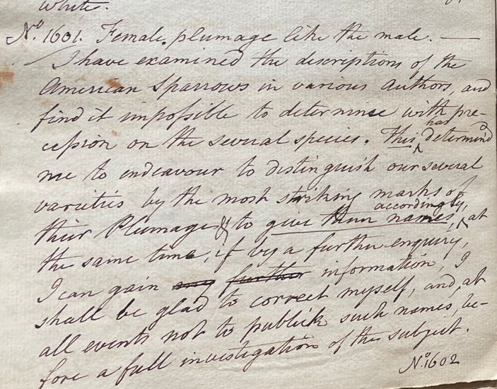 Charles Willson Peale (1741-1827) wrote, in his 34th Lecture (ca. 1799): "No. 1600. Light red Bill sparrow. This is one of our smallest sparrows, we find the, early in the spring enlivening that charming season, by their pleasing notes, perched on the tops of small trees in the neighborhood of the city. Their light flesh coloured bill distinguishes [them] from other sparrows; the head, back and wings are ferruginous striped with black and grey; all the under parts are a dingy white. No. 1601. Female. plumage like the male. I have examined the description of the American sparrows in various authors, and find it impossible to determine with precision on the several species. This had determined me to endeavour to distinguish our several varieties by the most striking marks of their plumage & to give them names, accordingly, at the same time, if by a further enquiry, I can gain information, I shall be glad to correct myself, and, at all events not to publish such names, before a full investigation of the subject." (Academy of Natural Sciences of Drexel University Archives, coll. 40)