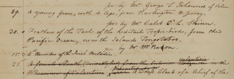 On 30 June 1813, "Feathers of the Tail of the Red-Tail Tropic-Bird, from the Pacific Ocean, near the Islands Tongotaboo [Tongatapu]" were donated by M. Bacon, as recorded in the Peale Museum Accessions Book (Historical Society of Pennsylvania, coll. 0481).